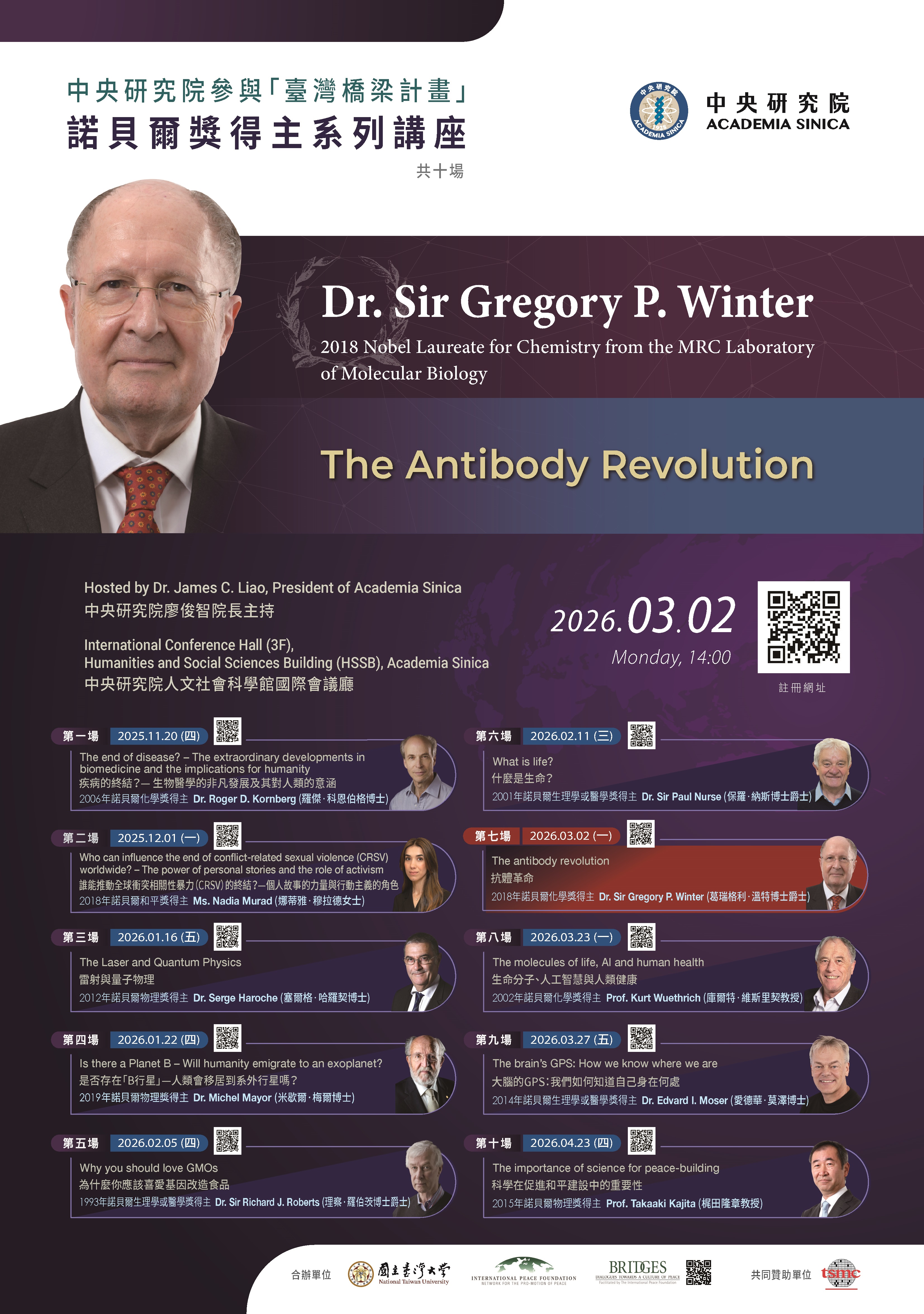 | 公告主旨 | 中央研究院參與「臺灣橋梁計畫」邀請諾貝爾獎得主葛瑞格利.溫特(Gregory P. Winter)博士爵士蒞院發表專題演講,請有興趣的師生自由參加。 |