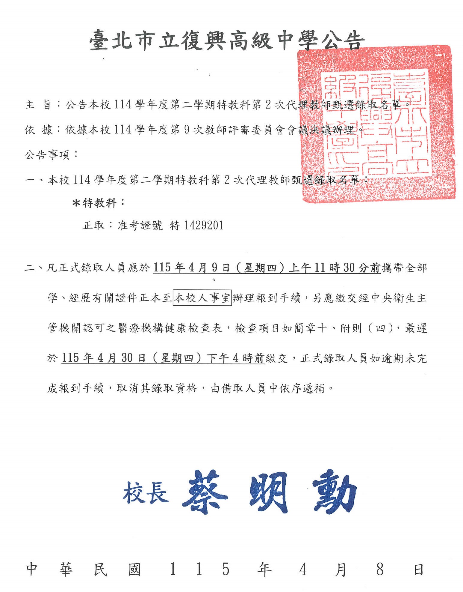 校園公告 公告主旨 公告本校114學年度第二學期特教科第2次代理教師甄選錄取名單 發佈日期 2026 年 4 月 08 日 發佈單位 人事室 公告類別 最新消息 公告等級 公告 點閱次數 258 公告內容 相關附件 【2026-04-09】臺北市學校環境教育中心「環境教育教學模組課程設計」正式上線, ... 【2026-04-08】114學年度世界史專題工作坊-泛伊斯蘭主義的歷史根源