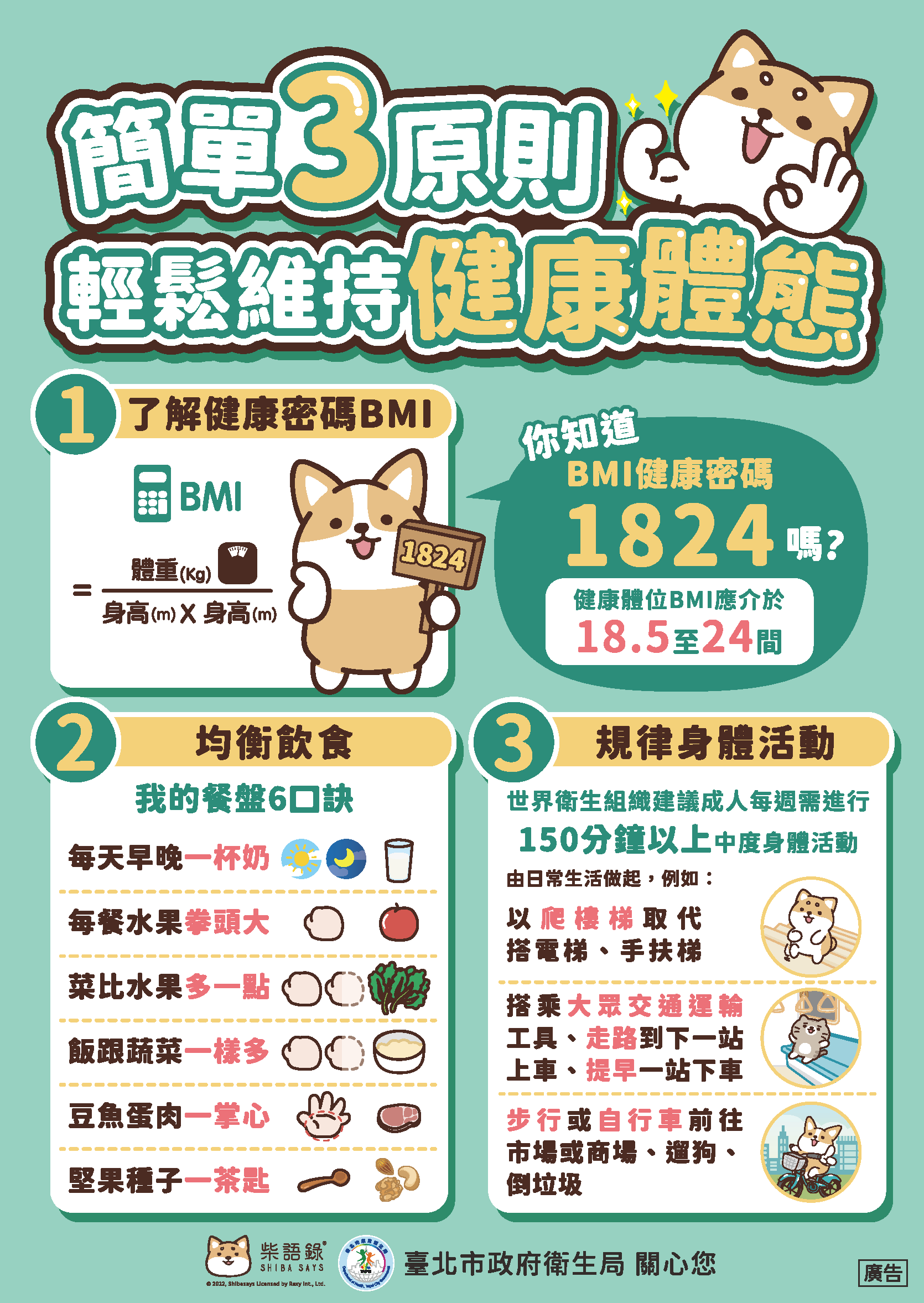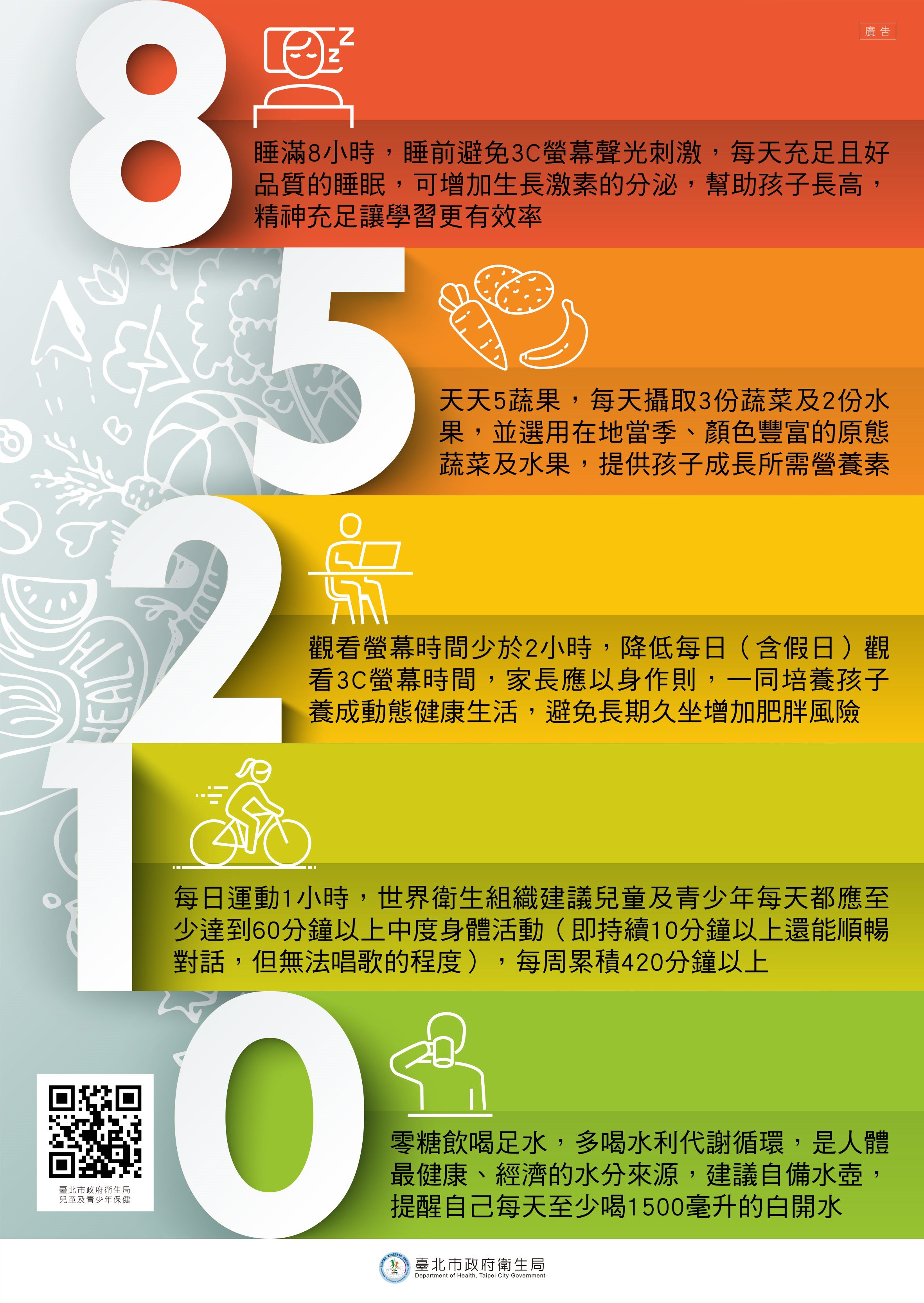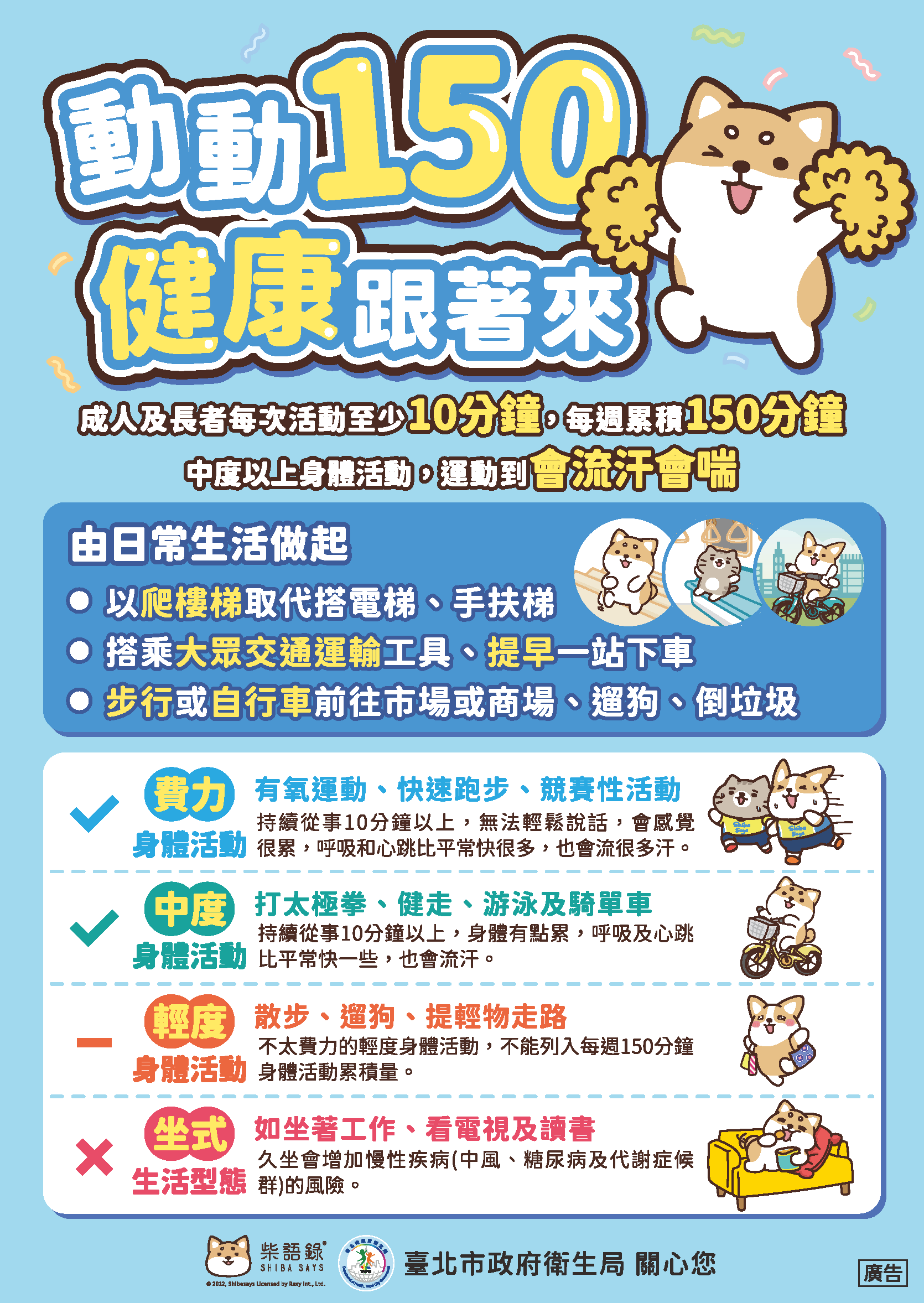 💡 衛生組小叮嚀: 每天累積 60 分鐘的中高強度活動(會喘、會流汗的程度),讓你的體力與腦力同時升級! |