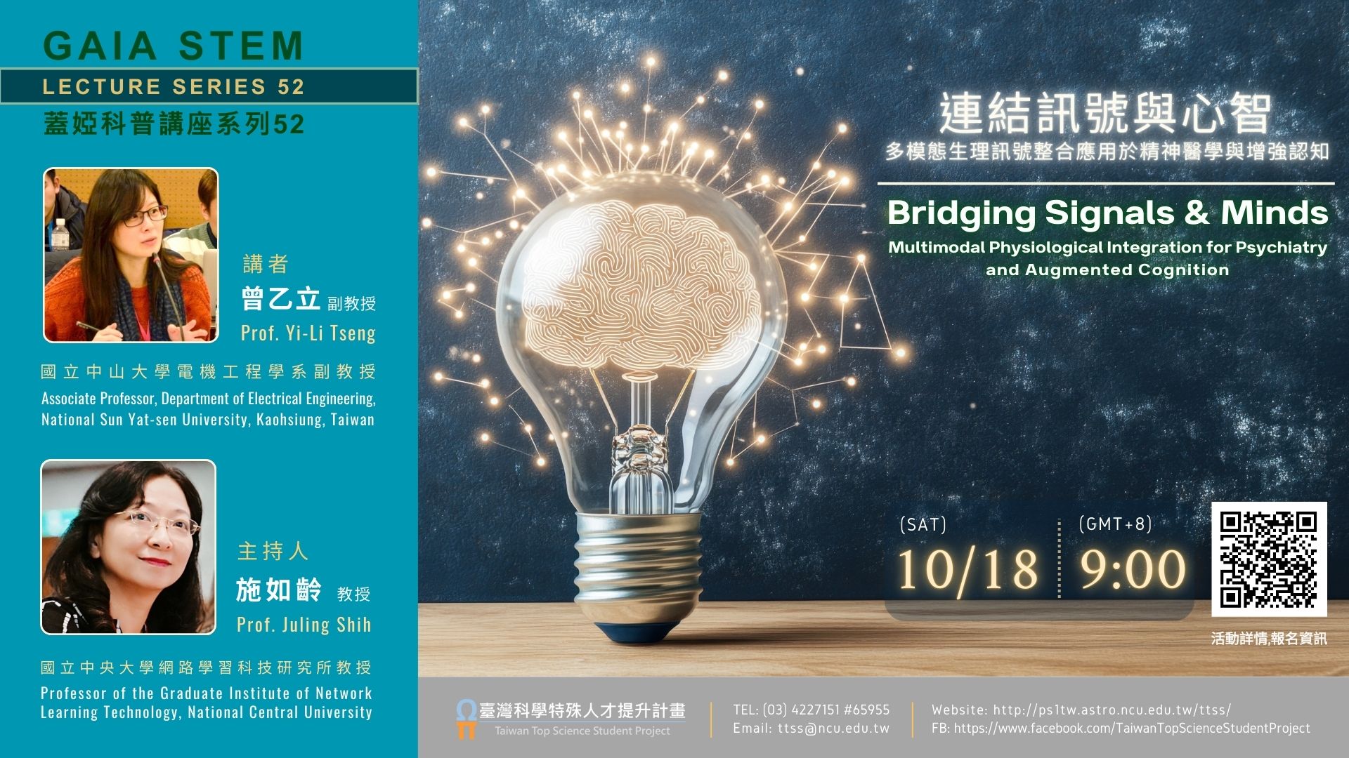 公告主旨 | 中央大學訂於114年10月18日辦理線上講座:《蓋婭科普講座系列 52》—— 「連結訊號與心智:多模態生理訊號整合應用於精神醫學與增強認知」,請有興趣的師生自由參加。 |