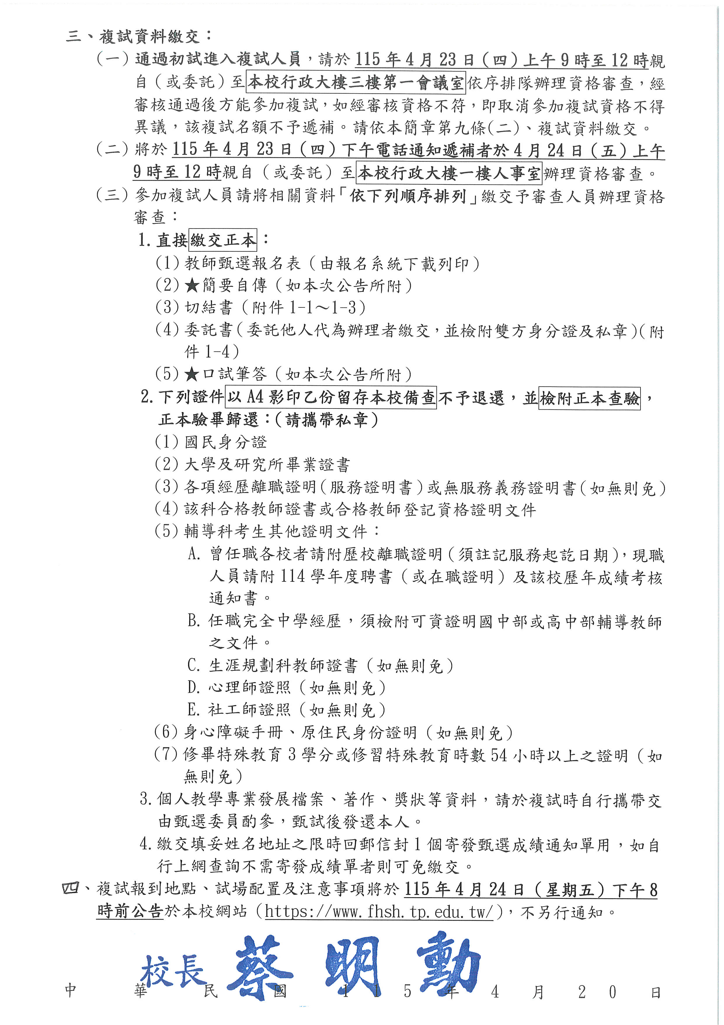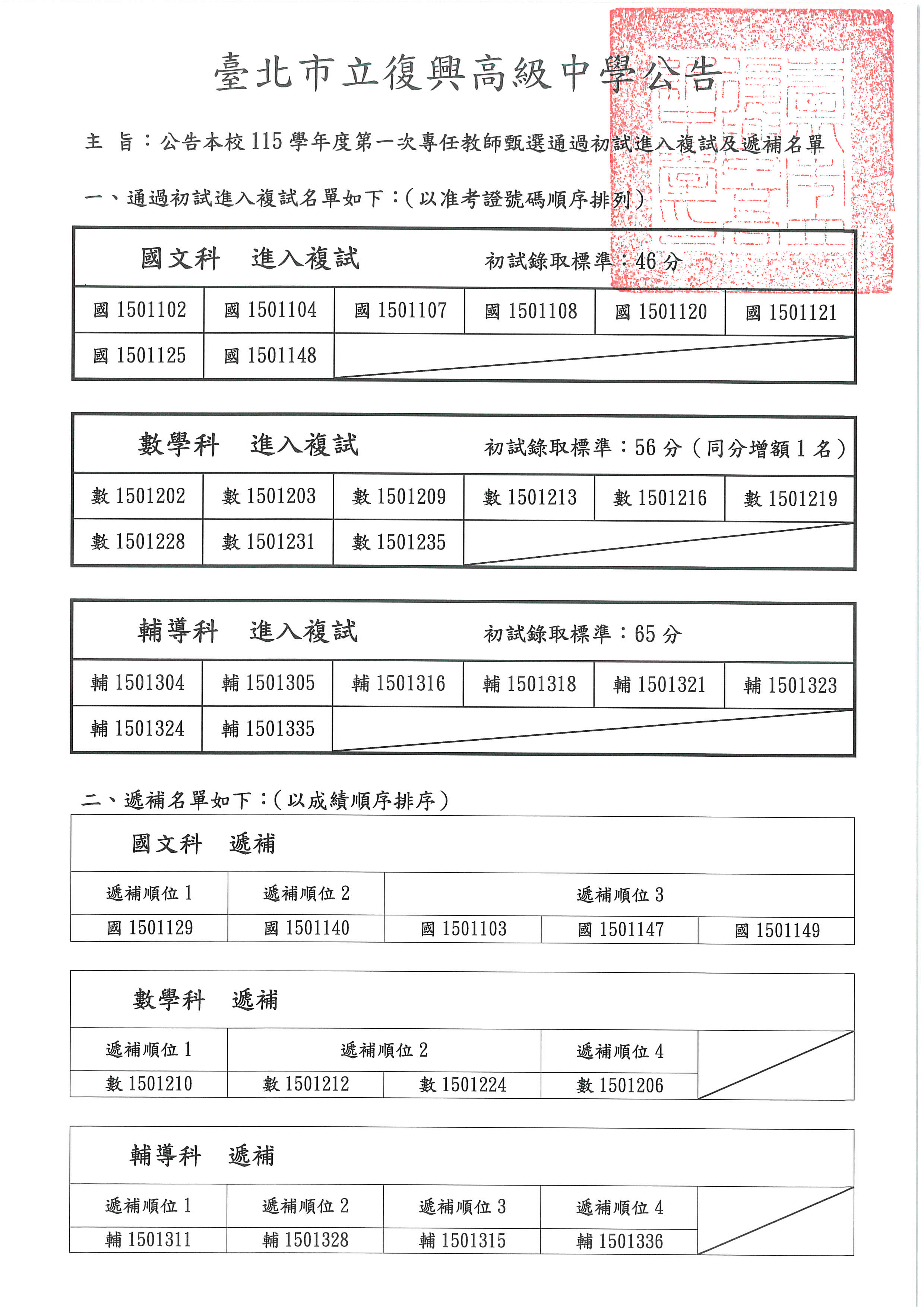 校園公告 公告主旨 公告本校115學年度第一次專任教師甄選通過初試進入複試及遞補名單 發佈日期 2026 年 4 月 20 日 發佈單位 人事室 公告類別 最新消息 公告等級 公告 點閱次數 219 公告內容 相關附件 ★簡要自傳 ★簡要自傳 檔案名稱檔案大小檔案格式下載★簡要自傳.odt7.25 KB新視窗開啟檔案 ★簡要自傳.odt ★口試筆答 ★口試筆答 檔案名稱檔案大小檔案格式下載★口試筆答.pdf93.22 KB新視窗開啟檔案★口試筆答.odt11.73 KB新視窗開啟檔案 ★口試筆答.pdf★口試筆答.odt 校園鳥瞰圖 校園鳥瞰圖 檔案名稱檔案大小檔案格式下載臺北市立復興高級中學校園鳥瞰圖.pdf688.48 KB新視窗開啟檔案 臺北市立復興高級中學校園鳥瞰圖.pdf 【2026-04-20】臺北市政府教育局辦理「2026臺北市第2屆首都盃國際技能競賽」, ...