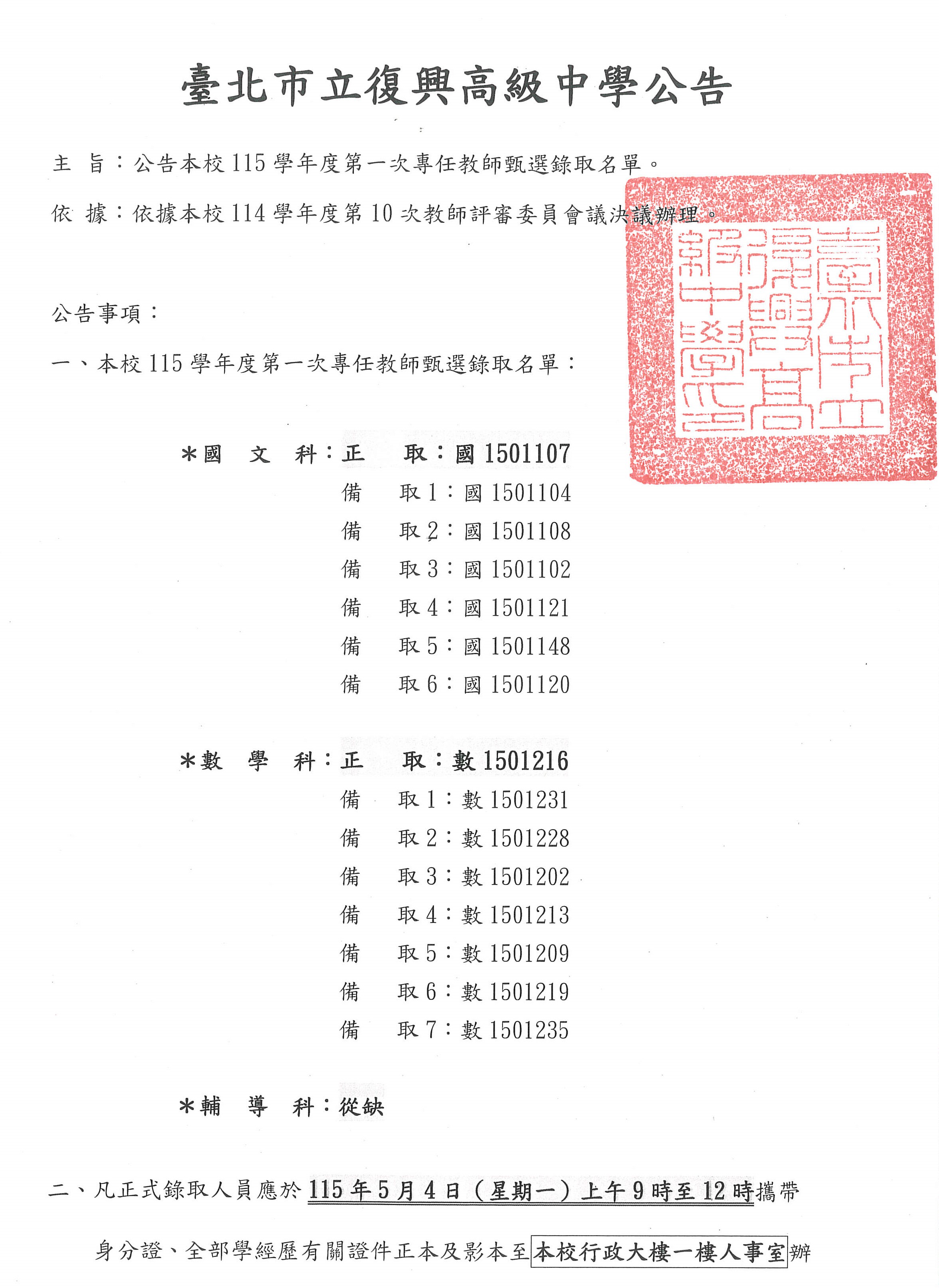 校園公告 公告主旨 公告本校115學年度第一次專任教師甄選錄取名單 發佈日期 2026 年 4 月 27 日 發佈單位 人事室 公告類別 最新消息 公告等級 公告 點閱次數 197 公告內容 相關附件 【2026-04-27】推廣本土語言教學與多語文競賽【字音字形建議識字詞彙】