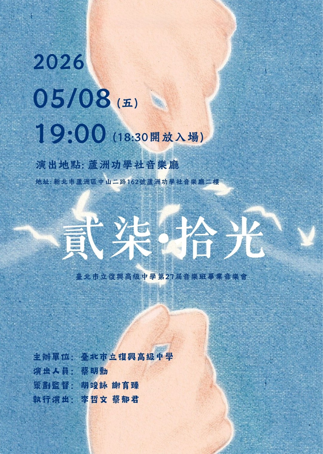 校園公告 公告主旨 臺北市立復興高中音樂班第27屆畢業音樂會《貳柒 拾光》 發佈日期 2026 年 4 月 23 日 發佈單位 藝術才能組 公告類別 最新消息, 校內藝文展演, 教師研習, 學生活動 公告等級 公告 點閱次數 33 公告內容 【音樂班畢業音樂會宣傳】 臺北市立復興高中音樂班第27屆畢業音樂會《貳柒 拾光》 2026年5月8日星期五晚上 19:00 (18:30開放入場) 演出地點:蘆洲功學社音樂廳 (新北市蘆洲區中山二路162號蘆洲功學社音樂廳二樓) 主辦單位:臺北市立復興高級中學 演出人員:蔡明勳 策畫監督:胡竣詠 謝育臻 執行演出:李哲文 蔡郁君 相關附件 【2026-04-23】「2026全民國防教育暨防衛動員學術研討會」 【2026-04-23】AI智慧車輛-電動車實務 維修培訓課程研習