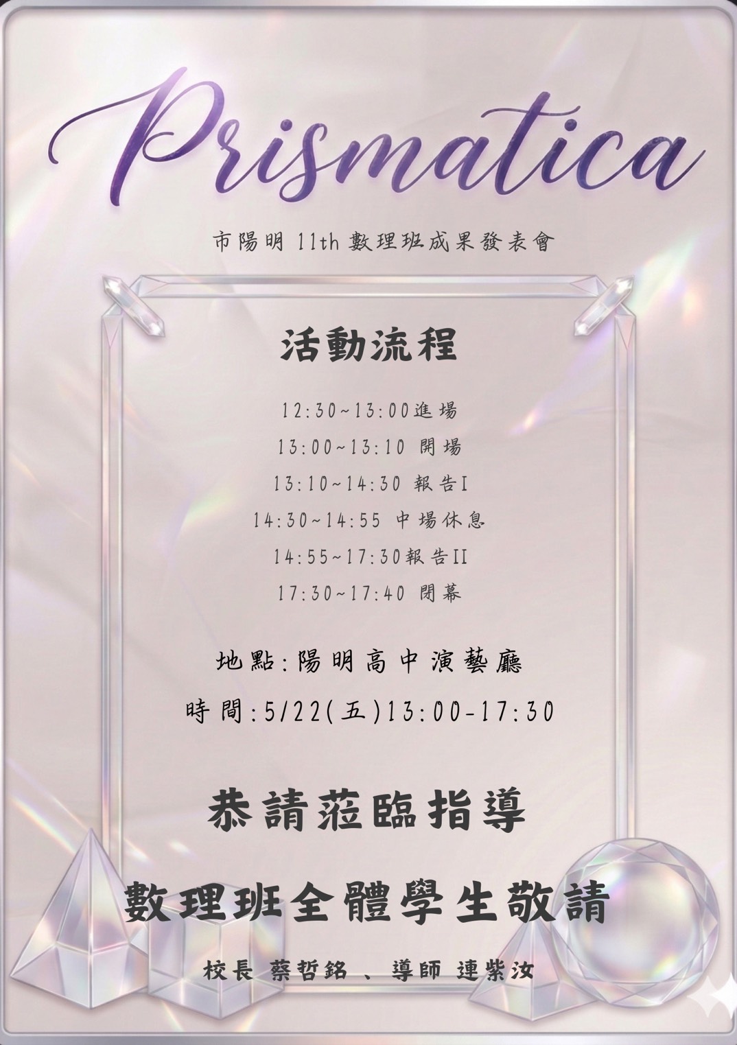 | 公告主旨 | 臺北市立陽明高級中學第十一屆數理科學班將於115年5月22日(星期五)舉辦成果發表會,請有興趣的師生自由參加。 |
