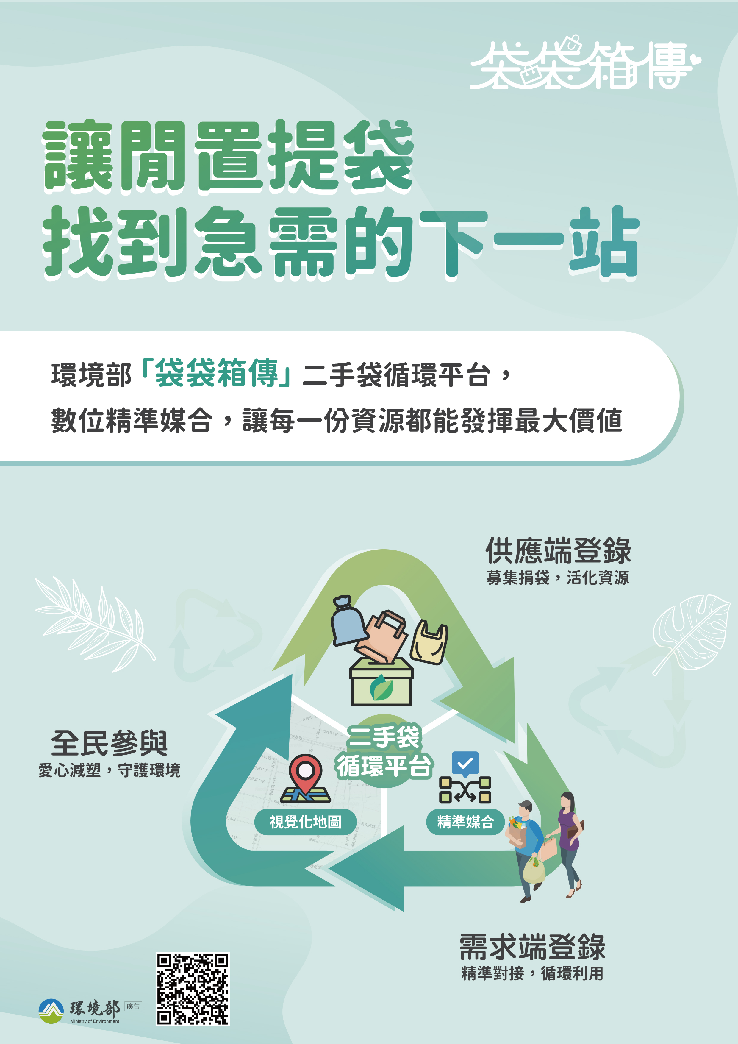 | 公告內容 | 各位老師、同學大家好: 為因應全球環境挑戰、落實資源源頭減量,邀請全校師生共同響應環境部推出的「袋袋箱傳」二手袋循環平台,一起在校園中推廣減塑文化! 🌍 什麼是「袋袋箱傳」? 環境部建置此平台,旨在串聯「提供二手袋」與「需要二手袋」的兩端,讓閒置的二手紙袋及購物袋得以循環流動,實現「減廢、省錢、護地球」的共贏生活圈。 ♻️ 我們可以怎麼做? 認識與使用平台: 若您個人或社團活動有大量閒置的二手袋,或臨時有提袋需求,可直接至平台登錄供應或提出申請。 愛護地球從日常小事做起,讓我們一起讓資源循環最大化! 🔗 相關連結: 環境部「袋袋箱傳」二手袋循環平台 |