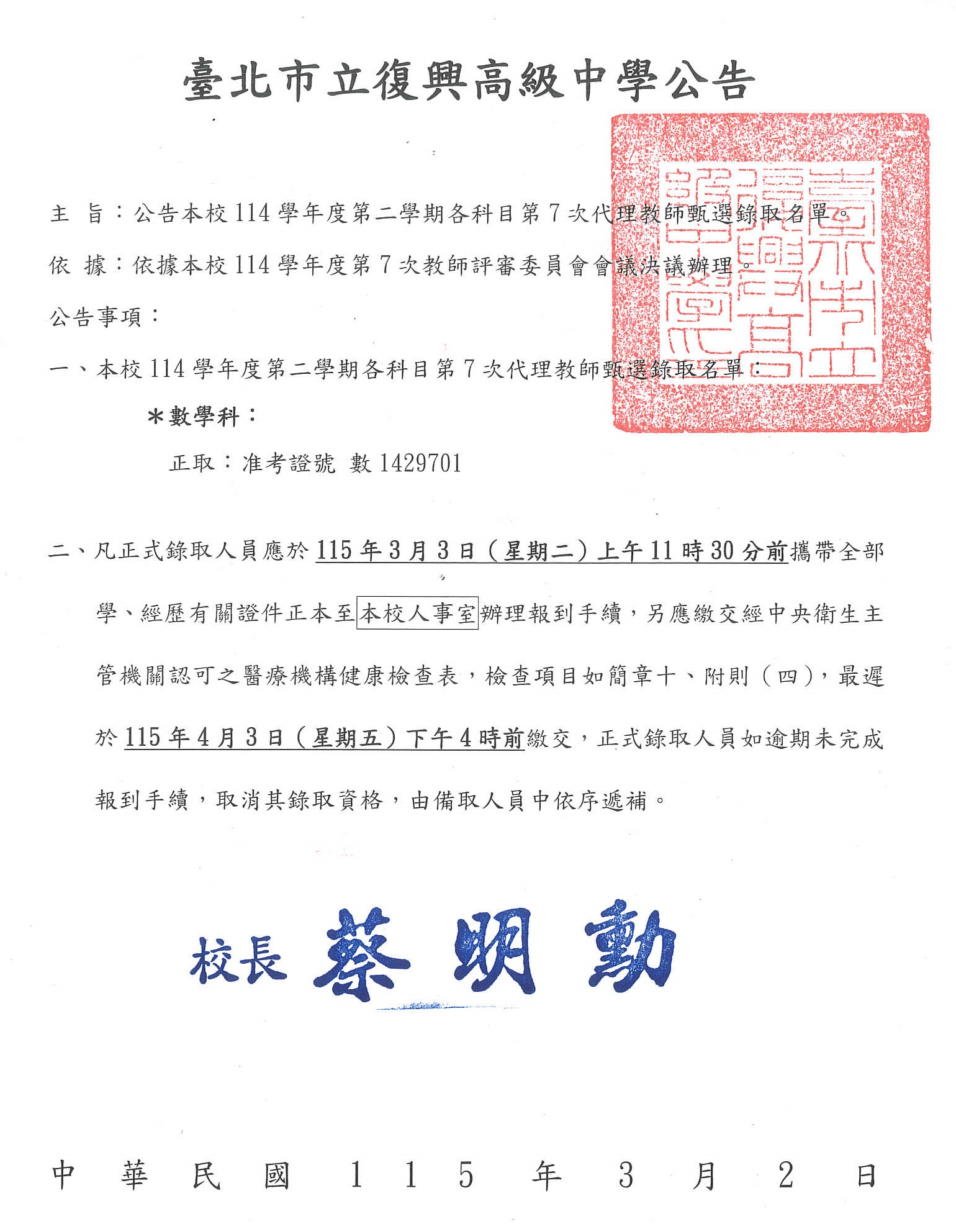 校園公告 公告主旨 114學年度第二學期數學科第7次代理教師甄選結果 發佈日期 2026 年 3 月 02 日 發佈單位 人事室 公告類別 最新消息 公告等級 公告 點閱次數 119 公告內容 相關附件 【2026-03-03】遊戲融入生物教學-神經風暴 【2026-03-02】【公告】114學年度市長獎評選辦法,詳如附件。