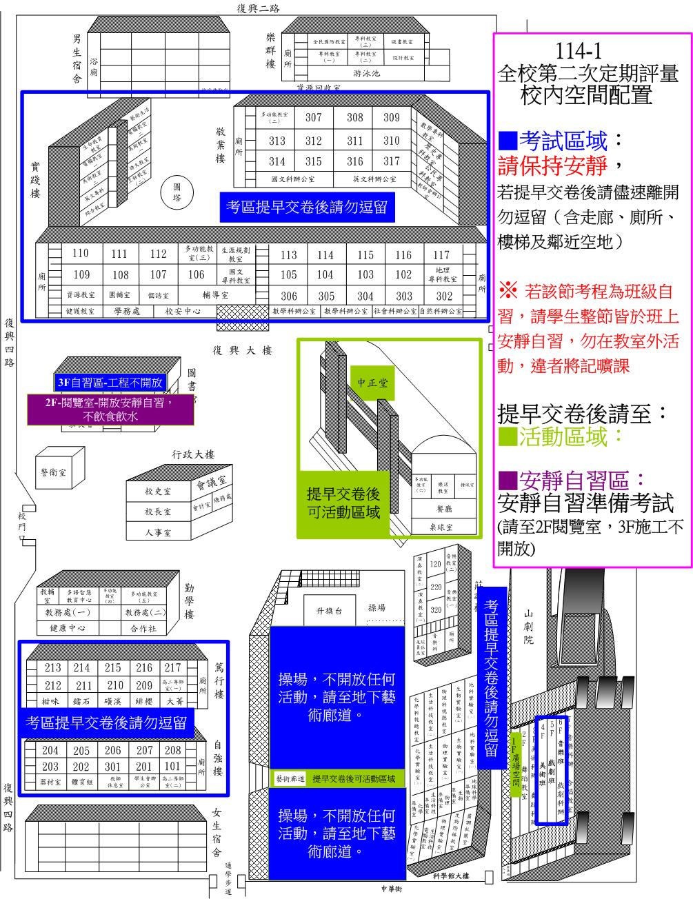 校園公告 公告主旨 114-1 全校【第二次】定期評量測驗前提醒及空間平面圖 發佈日期 2025 年 12 月 01 日 發佈單位 教學組 公告類別 最新消息, 學生活動 公告等級 公告 點閱次數 141 公告內容 114/12/02(二)、114/12/03(三) 為高一、 高二、高三定期評量測驗, 請同學事先詳閱考試規則,尊重考場規則與秩序。 仔細閱讀校內平面圖,考試區域,避免干擾試場秩序。 預祝 考試順利! 相關附件 【2025-12-01】領航20,智慧未來』普高工作圈及學科中心20週年研討會暨成果展 【2025-12-01】《國際總動援 Mission in theWorld》議題式桌遊教師研習工作坊